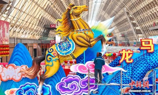 2月3日,在山东省青岛西海岸新区中铁世界博览城,来自“彩灯之乡”四川自贡的匠人们正忙着制作和组装大型灯组,迎接即将到来的马年春节灯会。该灯会预计展出百余组大型灯组,旨在激活节日文旅消费,营造红火兴旺的春节消费市场。图为工作人员在调整龙形灯组。(无人机照片)张进刚 摄