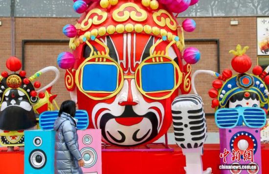 图为民众从“国潮脸谱”主题灯组前走过。张进刚 摄