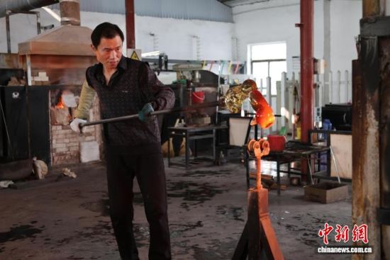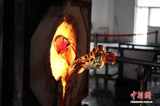 2月4日,山东淄博博山区,炉工在1400℃的炉火高温下手工烧琉璃。据了解,博山琉璃是中国传统琉璃工艺品,其历史可追溯至西周时期。近期,由当地琉璃制造企业开发的琉璃马文创,凭借俊美灵动的姿态,在线上线下热销。中新社记者 赵晓 摄