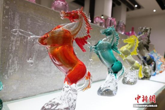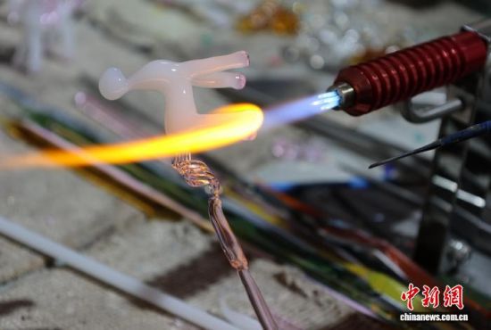 灯工在车间内用喷枪火焰制作生肖马文创。赵晓 摄