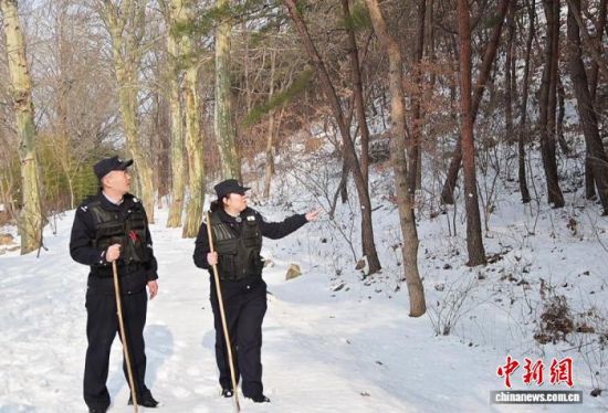 午后,积雪覆盖的山路上,昆嵛派出所所长张洋洲和民警王妍开始了巡护。