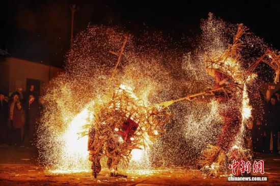 中新网山东邹城2月5日电(沙见龙 宋文强)“开门放虎!”夜幕降临,随着广场灯光骤然熄灭,密集的锣鼓声响起。一名身负特制“火甲”的表演者踩上高跷,周身瞬间迸发出数千条金色火线,宛如猛虎现身。与之对峙的“打虎人”手持火捻哨棒,腾挪扑闪间,火星如瀑流泻,照亮夜空。