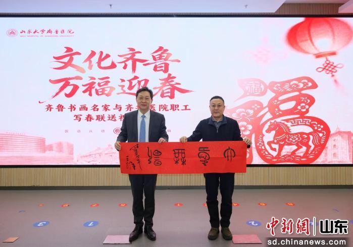 齐鲁医院举办“文化齐鲁 万福迎春”2026年齐鲁书画名家与医院职工写春联送祝福活动。齐鲁医院供图当天,山东省文联党组成员、副主席马述兴代表省文联向医院赠送书法作品,陈鑫代表医院上台接受捐赠,并向省文联、省书协各位书法专家致以诚挚谢意,感谢他们为医院带来的珍贵墨宝。