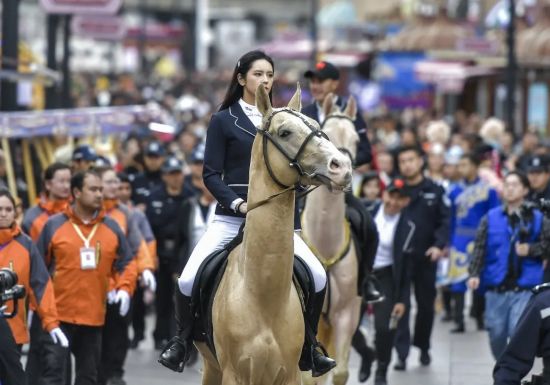 2024年4月11日,新疆乌鲁木齐,新疆国际大巴扎举行开街仪式,汗血宝马惊艳亮相并向游客行礼致意,吸引民众围观。 中新社记者 刘新 摄