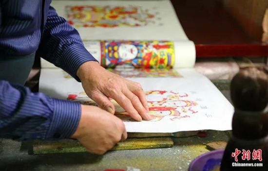国家级非遗武强木版年画代表性传承人马习钦在印制年画。张凯 摄