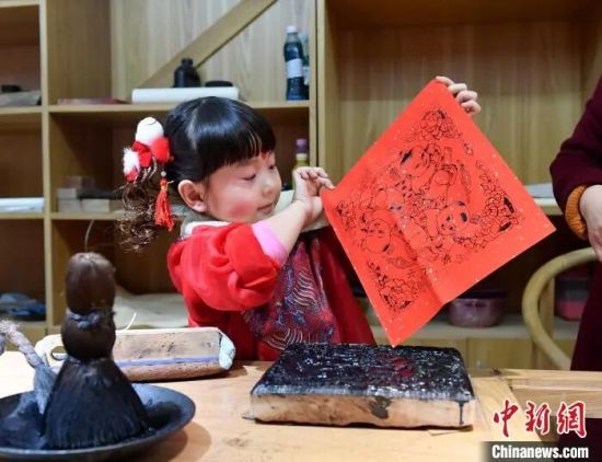 萌娃体验印制武强木版年画。苏小立 摄