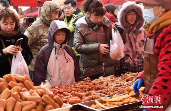 2月10日,山东烟台,福山大集上的炸货吸引民众选购。中新社记者 王娇妮 摄
