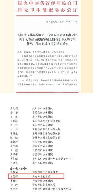 近日,国家中医药管理局、国家卫生健康委联合公布了妇幼健康领域全国名老中医药专家传承工作室建设项目名单,济南市儿童医院推拿科范美丽主任团队凭借在中医儿科推拿领域的深厚造诣与突出临床贡献成功获批。