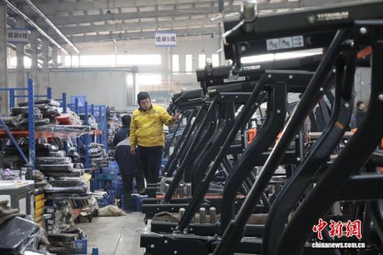 图为山东布莱特威健身器材有限公司生产车间内,工人在组装健身器材。 周艺伟 摄