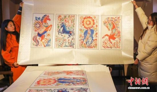 胶东版画也紧跟年味。在烟台一间胶东版画工作室里,朱武学正俯身精雕奔马版画,木屑轻轻落下,一匹骏马的轮廓逐渐清晰。他创作的《骏业宏图》以传统吉祥纹样为背景,奔马脚踏祥云与繁花,意境开阔。融合版画艺术特色设计的马年生肖布偶,一经推出便广受青睐。