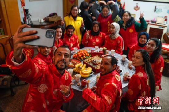 2022年1月25日,外籍学生、客商等欢聚一堂,身着“中国红”服饰,共度中国小年并体验当地民俗。中新社记者 董易鑫 摄