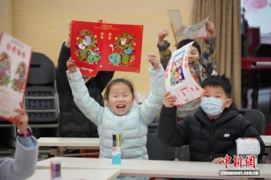 2021年2月4日,中国传统节日——小年。图为制作完年画的小学生兴奋不已,等待老师发灶糖。中新社记者 阚力 摄