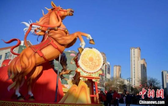 在山东济南印象济南休闲街区,骏马装置吸引市民游客打卡拍照。中新社记者 张勇 摄