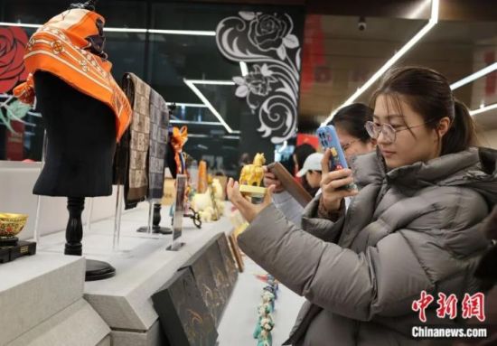2026年2月10日,《騄駬腾骧——孔府过大年文物展》在山东曲阜孔子博物馆开幕。该展览共展出100多件孔府旧藏文物,其中与马相关的文物10余件。图为以战国黄玉马为原型设计的文创产品吸引观众选购。 中新社记者 赵晓 摄