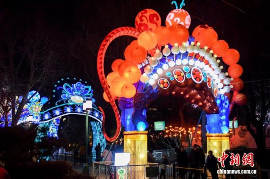 2月12日,山东济南第45届天下第一泉迎春花灯会试亮灯。景区内灯火璀璨,年味满盈,吸引了不少市民和游客前来赏灯。图为花灯会进行亮灯调试。