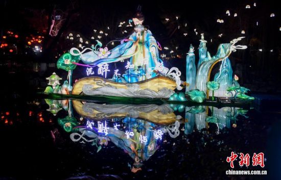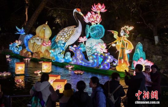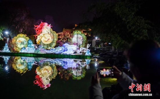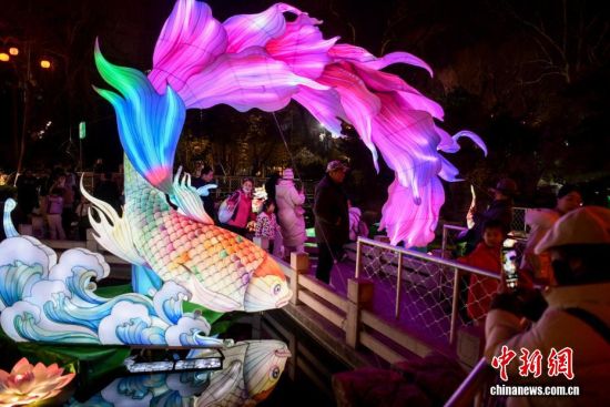 2月12日,山东济南第45届天下第一泉迎春花灯会试亮灯。景区内灯火璀璨,年味满盈,吸引了不少市民和游客前来赏灯。图为游客观赏花灯。