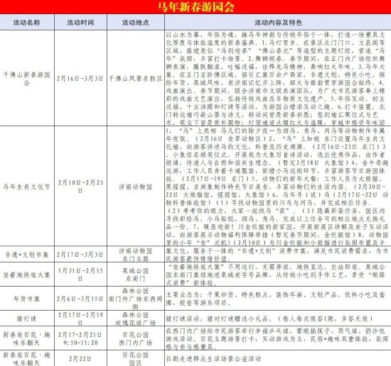 新春将至,年味愈浓。为迎接2026马年新春,济南市公园发展服务中心组织所属的济南千佛山风景名胜区、济南动物园、济南植物园、泉城公园、中山公园、英雄山风景区、森林公园、百花公园、花圃公园9个公园景区,围绕9大主题,策划推出“泉”在济南过大年50余项系列新春游园活动,诚邀广大市民和外地游客来济南公园过大年、迎新春。