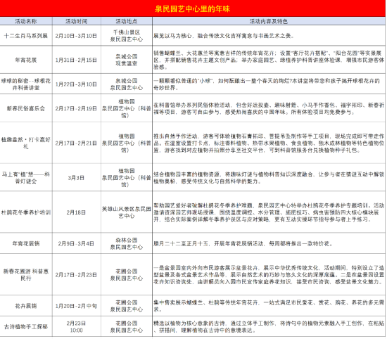 各公园泉民园艺中心联动,打造集花卉展销、园艺科普、手工体验于一体的新春园艺盛宴,让满园花香点缀新春。济南千佛山景区推出十二生肖马系列展,融合传统文化与书画艺术;济南植物园推出新春民俗喜乐会、植趣盎然打卡赢好礼,免费手作、植物打卡兑换好礼,还有植物科普灯谜会解锁自然奥秘;泉城公园年宵花展搭配球根花卉科普讲堂,实景展区展示花卉搭配技巧,园艺讲座解锁养护干货;森林公园、花圃公园开展年宵花、特色花卉展销,盆景展、花卉知识咨询、古诗植物手工探秘等活动;英雄山风景区开设杜鹃花冬季养护培训,资深园艺师现场授课,实操指导破解养护难题。