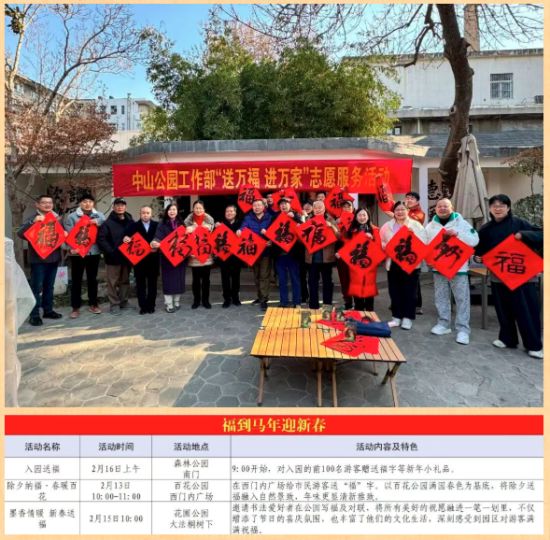 福字传情,春联送喜,将新春美好祝愿融入墨香,为市民游客送上满满年味。森林公园正月初一入园前 100 名游客赠福字好礼,百花公园除夕当天西门内广场现场送福,花圃公园邀请书法爱好者在大法桐树下写福、写对联,一笔一划间勾勒新春美好。