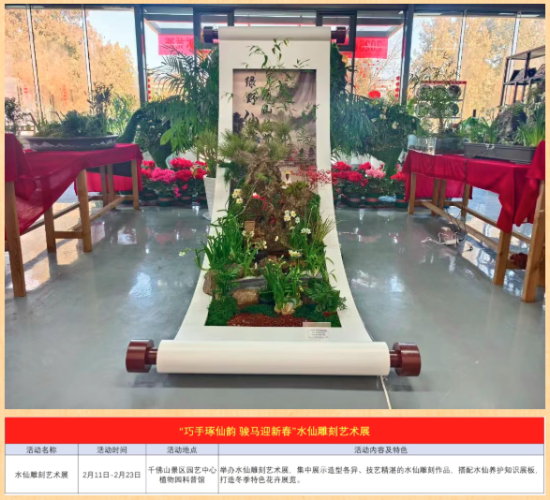 “巧手琢仙韵 骏马迎新春”水仙雕刻艺术展在济南千佛山景区园艺中心、济南植物园科普馆同步展出,集中展示造型各异、技艺精湛的水仙雕刻作品,搭配水仙养护知识展板,让市民游客在欣赏传统雕刻技艺之美的同时,习得花卉养护知识,打造冬季特色花卉观赏体验。