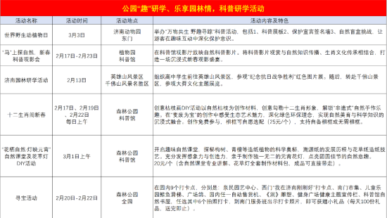 融合自然科普、红色文化、手工创作,打造全龄段趣味科普研学体验,让游客在游玩中解锁知识、收获成长。济南动物园开展世界野生动植物日科普活动,科普展板、签名墙、自然盲盒挑战深化保护意识;济南植物园放映马年新春科普观影会,自然影片搭配生肖文化,沉浸式传播自然知识;英雄山风景区开展济南园林研学活动,组织青少年参观红色图片展、大舜文化主题展览,感悟历史与文化;森林公园推出十二生肖闹新春枯枝画 DIY、花草灯 DIY,创意手作融合绿色环保理念,还有全园寻宝打卡活动,9大打卡点任选6个即可兑换好礼,趣味十足。