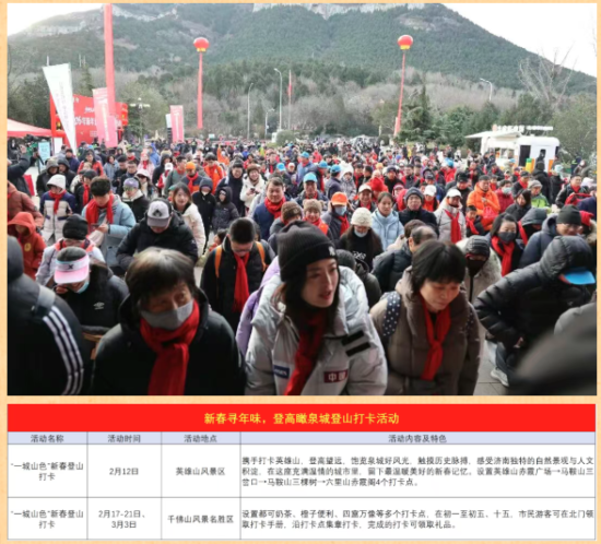 以登山打卡为载体,解锁泉城山水之美,感受自然与人文交融的新春韵味,以登高祈福的传统习俗迎接新年好彩头。济南千佛山景区、英雄山风景区开展新春登山打卡活动,邀市民登高望远、触摸历史脉搏;让市民在登山揽胜、饱览泉城风光的同时收获新春惊喜。