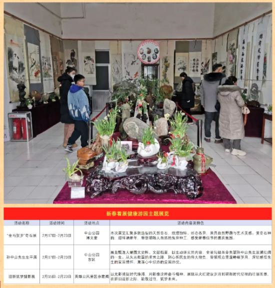 中山公园举办“金马贺岁”奇石展、孙中山先生生平展,奇石展领略大自然的鬼斧神工,生平展重温革命先驱的家国情怀;英雄山风景区在赤霞阁开展迎新筑梦摄影展,以光影捕捉时代脉搏,用影像诠释奋斗精神,致敬过往,筑梦未来,让市民游客在游园的同时感受文化魅力。