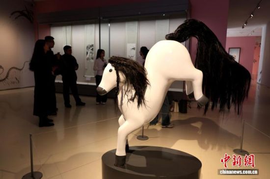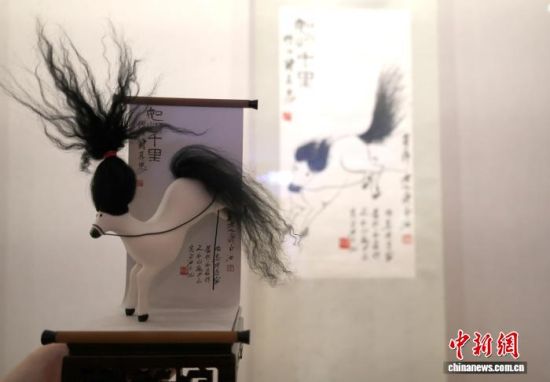 2月13日,山东济南,“马彪彪”雕塑亮相展览现场。当天,由北京画院珍藏的齐白石《十二属图》亮相山东美术馆“学我者生——齐白石与山东弟子”特展。展览现场,“网红”马彪彪与原作《如此千里》同框展出。赵晓 摄