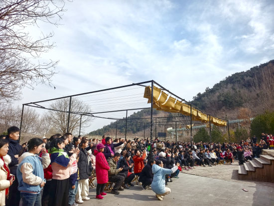 提及美食,沂蒙石海旅游区重磅推出的焖窑烤地瓜香飘满园,成为最接地气的场景之一:游客手捧热乎乎的烤地瓜,在炊烟中,仿佛回到儿时的村口。在这里,游客和萌宠动物互动、逛新春庙会、尝特色小吃、看精彩杂技,相亲大会、歌王争霸赛、广场舞大赛氛围热烈非常。晚间,大型灯光幻境点亮夜空,千人电音蹦迪、非遗打铁花、火壶、篝火晚会轮番嗨翻!从早到晚热闹不息,传统庙会与现代游园相融共生。