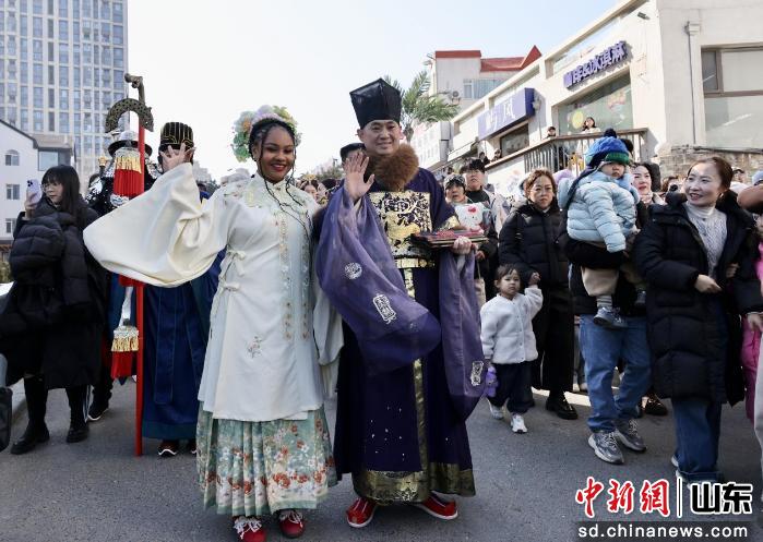 中新网山东新闻2月20日电 (张蕃 刘昊)琵琶悠扬,衣袂翻飞。2月19日,山东威海网红打卡地火炬八街热闹非凡,“国风雅韵贺新春”汉服祈年表演在此温情上演。十余名身着汉服的表演者,踏着鼓乐节拍款款巡游,将传统服饰的一针一线之美与一步一摇之韵,融入滨海街区的新春图景。