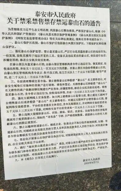 在泰山脚下买的工艺品石头,为何也成了“禁寄品”?这并非快递小哥“不愿寄”,而是严格执行当地的法律法规。媒体查询发现,2025年9月7日,泰安市人民政府曾发布一则《关于禁采禁售禁存禁运泰山石的通告》。
