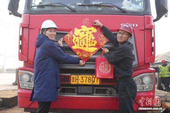 在春节到来之际,日照港现场工作人员为来港司机送上新春福袋。王刚 摄