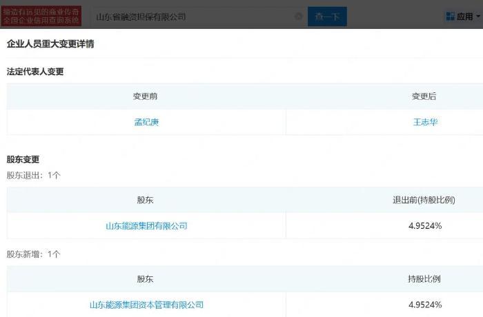 企查查显示,日前,山东能源集团有限公司(下称“山东能源集团”)退出山东省融资担保有限公司(下称“山东融担”),退出前持股比例为4.95%。该部分股权由山东能源集团旗下全资子公司山东能源集团资本管理有限公司(下称“山能资本”)“接手”。