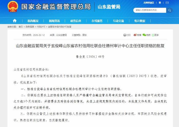 近日,国家金融监督管理总局山东监管局发布批复公告,核准了玄俊峰山东省农村信用社联合社(下称“山东省联社”)德州审计中心主任的任职资格。