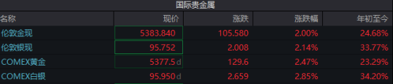 其中,现货黄金价格站上5300美元,截至发稿涨2%报5383.84美元/盎司;COMEX黄金盘中升破5400美元,截至发稿涨2.47%报5377.5美元/盎司。