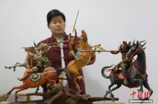 颍淮面塑艺人高光彪创作的《三英战吕布》面塑作品。中新网记者 韩辉 摄