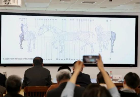 在《清华大学藏战国竹简(拾伍)》暨校释、英译系列成果发布会上展出的战国马体部位名称推拟图。 中新社记者 易海菲 摄