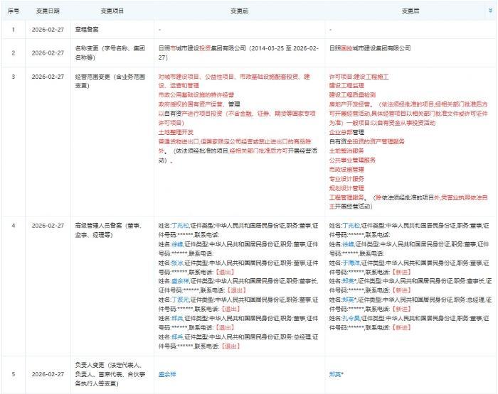 该公司名称变更为日照国控城市建设集团有限公司,经营范围从原有的“对城市建设项目、公益性项目、市政基础设施配套投资、建设、运营和管理;市政公用基础设施的特许经营;政府授权的国有资产运营、管理”等表述,变更为“建设工程施工;建设工程监理;建设工程质量检测;房地产开发经营”等。
