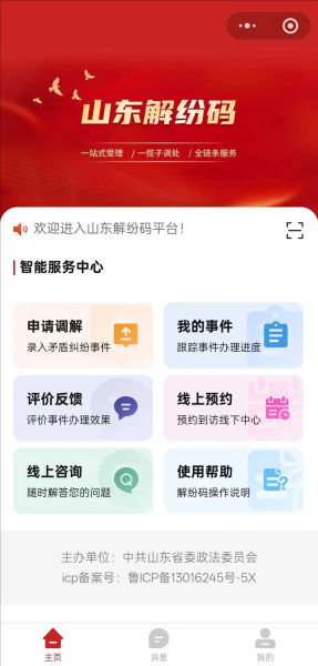 可在微信搜索“山东解纷码”小程序或扫描上方二维码进入解纷码首页,选择“群众入口”登录,录入身份证信息、联系方式,即可在平台“申请调解”。