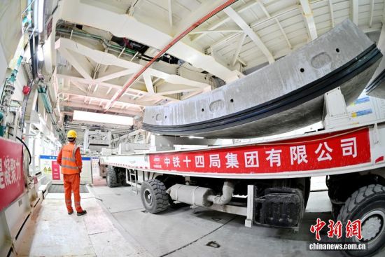 3月8日,青岛胶州湾第二隧道项目施工正酣。该项目是世界建设规模最大、长度最长、综合实施难度最高的海底道路隧道,采用明挖、盾构和钻爆法组合工法施工。该项目主线南线盾构段由中铁十四局集团负责施工,采用“海天号”超大直径盾构机掘进,能完成隧道开挖、衬砌、出渣等一体化作业,如同在海底深处“搭积木”般精密施工。图为管片运输车在运输隧道管片。丁翔 摄