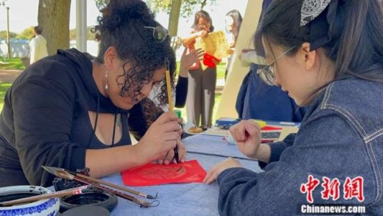 当地时间2025年4月17日,南非民众在开普敦伊兹科(Iziko)博物馆体验写“福”字。中新社记者 孙翔 摄