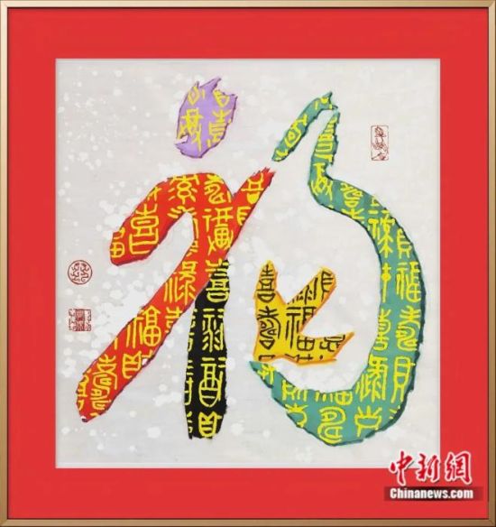 李树杰创作的书法作品“福”,寓意“福开五彩(财)”。受访者供图