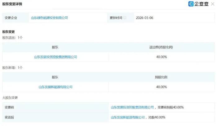 企查查显示,山东绿色能源投资有限公司(下称“山东绿色能源投资”)大股东发生变更,原持股比例40%的山东发展投资控股集团有限公司(下称“山东发展集团”)退出,其全资子公司山东发展新能源有限公司新增入股,持股比例40%。