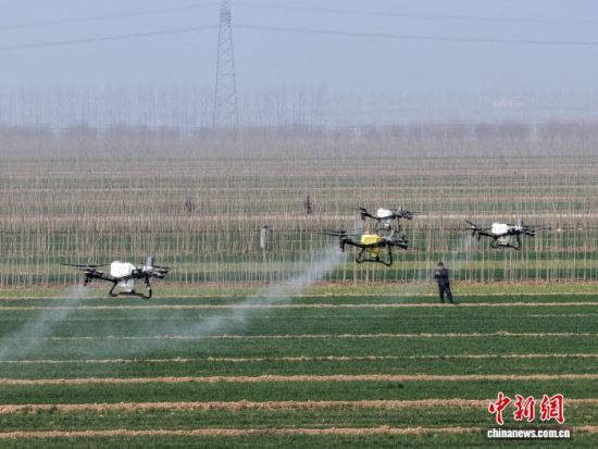 中新网济南3月13日电(记者 孙婷婷)春和景明,“90后”新农人张宾操控着无人植保机,掠过已经返青的麦田,细密的雾状药剂均匀洒落在茁壮的麦苗上。