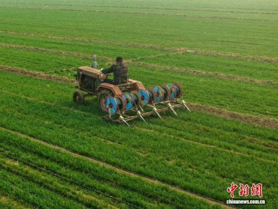 惊蛰过后,聊城市茌平区的麦田陆续返青。在振兴街道丰乐农民种植专业合作社的农田里,拖拉机轰鸣作业。当地的农灌设施安装户刘曰忠一早便开着拖拉机下了地,他身后的滴灌铺设机械隆隆前行,黑色的滴灌带顺着田垄铺开,接头处由工人现场完成安装。