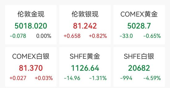 截至发稿,黄金白银悉数反弹。伦敦金现持平,报5018.02美元/盎司;COMEX黄金跌0.65%,报5028.7美元/盎司;伦敦银现涨0.82%,报81.242美元/盎司;COMEX白银涨0.03%,报81.37美元/盎司。