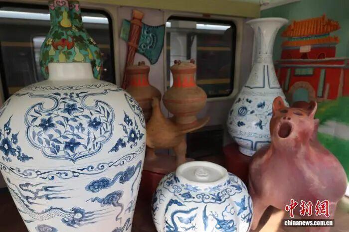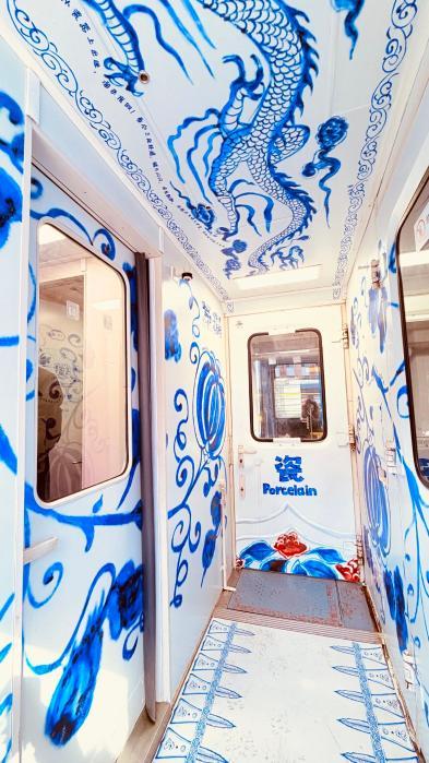 硬座车厢分为陶、瓷、服饰三大主题,古朴厚重的陶文化、清雅雅致的瓷韵味、庄重奢华的服饰风采,通过桌板、车壁的手绘海报与碎片化知识点,让乘客轻松汲取文物知识;