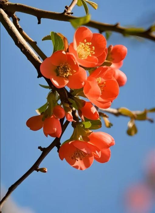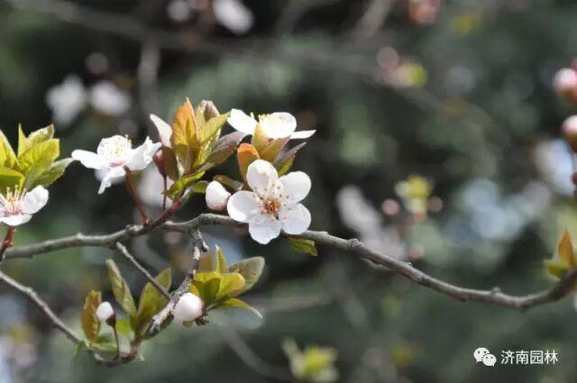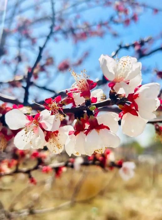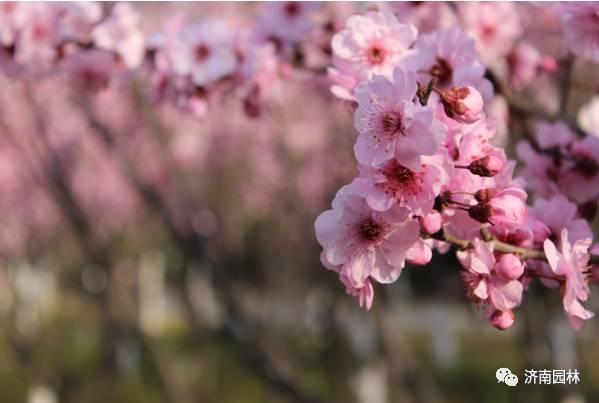 梅花凌寒先放,花期一至三月,无花梗贴枝而生,开花时无叶,枝条青绿,与杏花、桃花区分明显。梅花清雅暗香,是齐鲁早春风骨与诗意的象征。