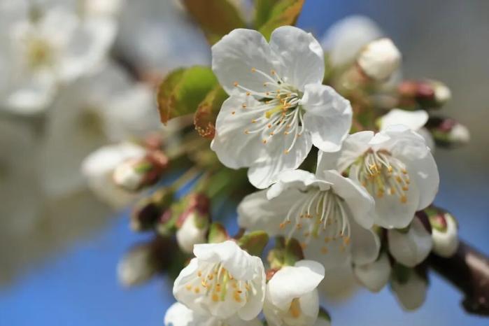 樱桃花是春日素雅先行者,三月中旬开放,花瓣洁白轻绢,花蕊细长淡黄,有明显花梗,成簇绽放。花谢后一两个月,樱桃便挂满枝头,是山东春日“花果相连”的代表。