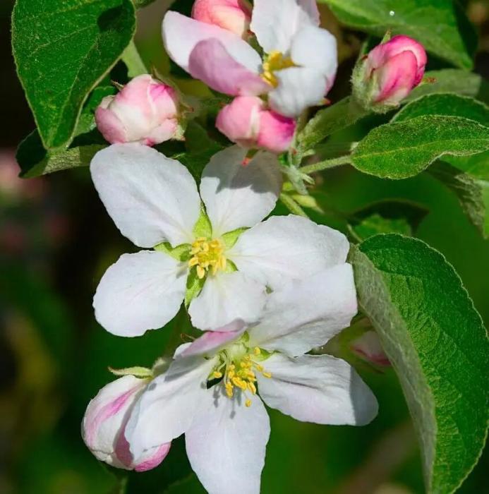 苹果花四月上旬开放,粉白相间,花瓣边缘色深,花蕊金黄,花姿端庄。叶片宽大带柔毛,有长花梗,与海棠花形似,却以独特温婉气质自成一格,承载着丰收的期许。
